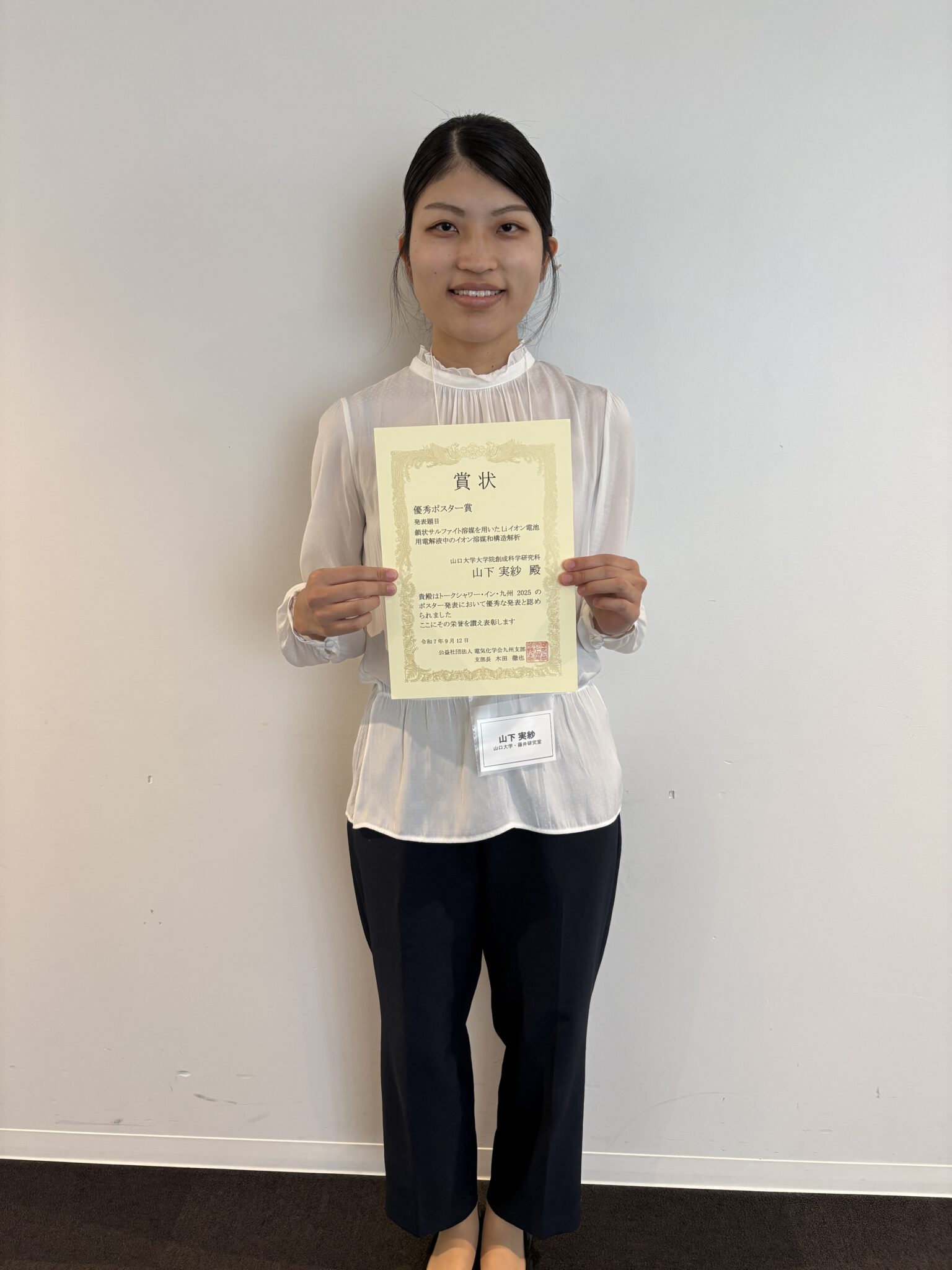未来博士3分間コンペティションでは、スライド1枚かつ持ち時間3分という制約の中で、様々な研究分野に身を置く博士課程後期学生が自身の研究のビジョンと魅力をプレゼンします。崔君はこれまでに、先日ノーベル化学賞を受賞したリチウムイオン電池におけるリチウムイオンの受け渡しを担う「電解質」に用いる材料として、安全で取り扱いやすいポリマー材料に着目し、その性能改善に取り組んできました。今回の受賞は、これらの成果に加え、自身の研究をわかりやすく伝える力が評価されたものです。博士前期課程1年・石川明日美さん(藤井研究室)が、山口大学研究推進体/物質構造研究会-第4回ジョイントセミナーにおいて「優秀ポスター賞」を受賞