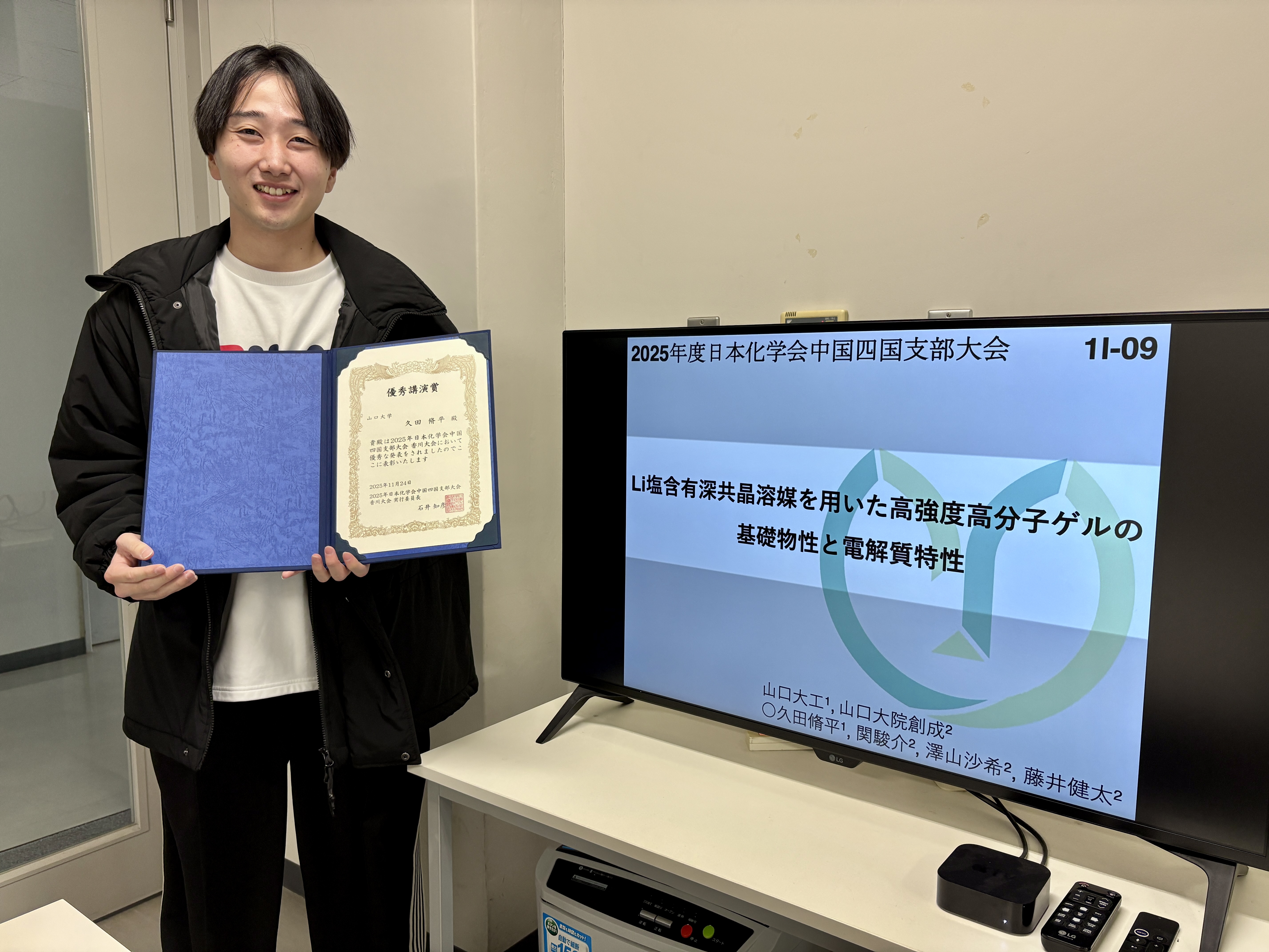 今回の講演では、リチウムイオン電池用イオン液体電解液を反応場として「分岐数の異なる多分岐高分子」の高効率ゲル化反応に取り組み、高分子濃度や分岐数の組み合わせ、ゲル化速度を最適化することでゲル電解質材料の力学特性や電気化学特性を自在にデザインできることを報告しました。応用化学科修士1年生・山田寛太君(吉田研究室)が学生講演賞を受賞
