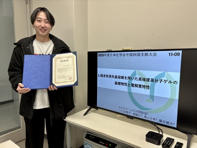 藤井研究室の久田脩平さんが2025年日本化学会中国四国支部大会香川大会において「優秀講演賞」を受賞しました。